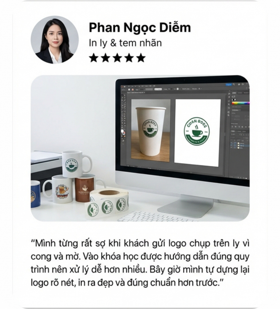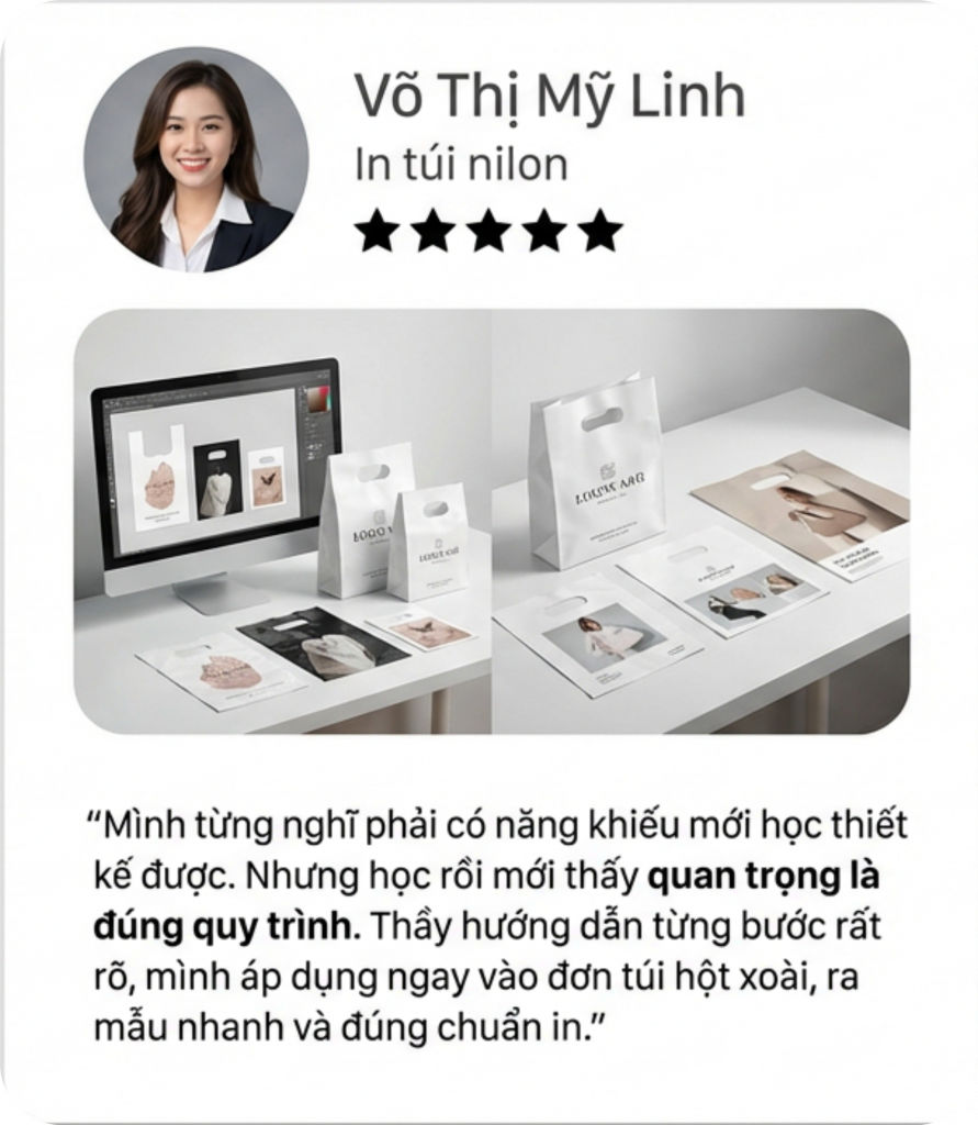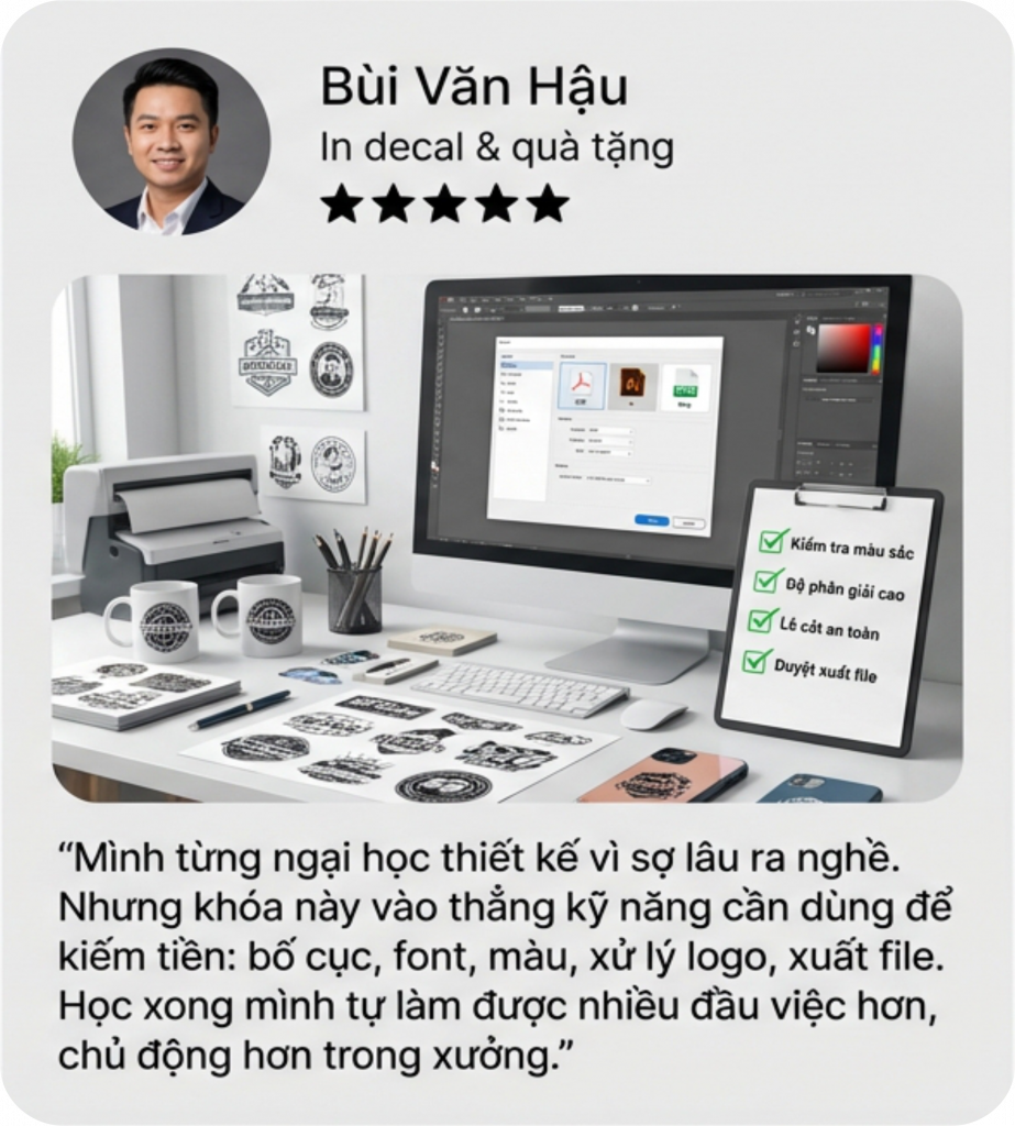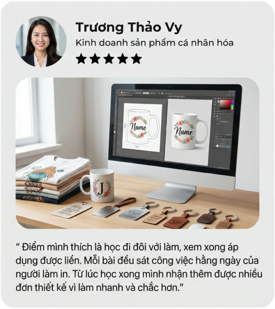 Mình bắt đầu biết đến nghề in từ công việc làm sale điện thoại. Từ đó, mình liên kết với các xưởng in và bán dịch vụ in. Dần dần, mình có nhiều khách hàng hơn và quyết định tự học thiết kế.
