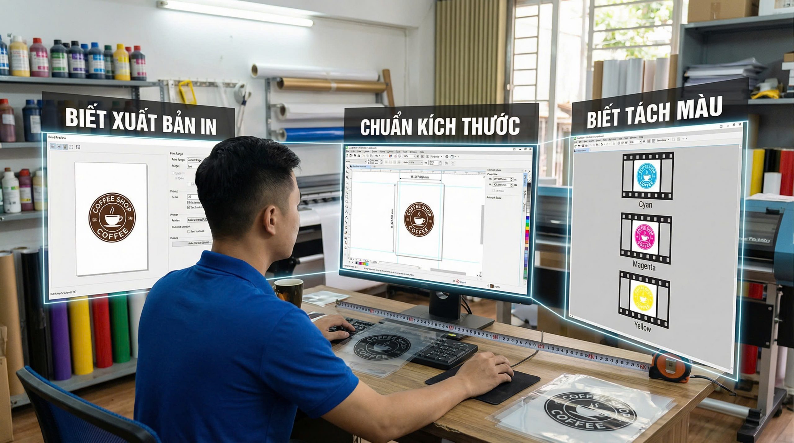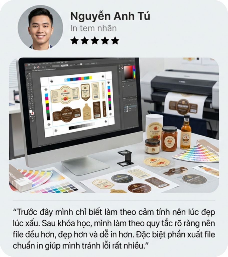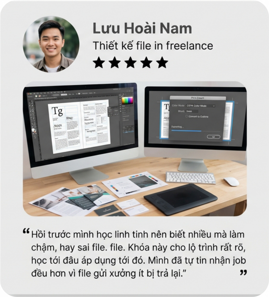 Mình bắt đầu biết đến nghề in từ công việc làm sale điện thoại. Từ đó, mình liên kết với các xưởng in và bán dịch vụ in. Dần dần, mình có nhiều khách hàng hơn và quyết định tự học thiết kế.